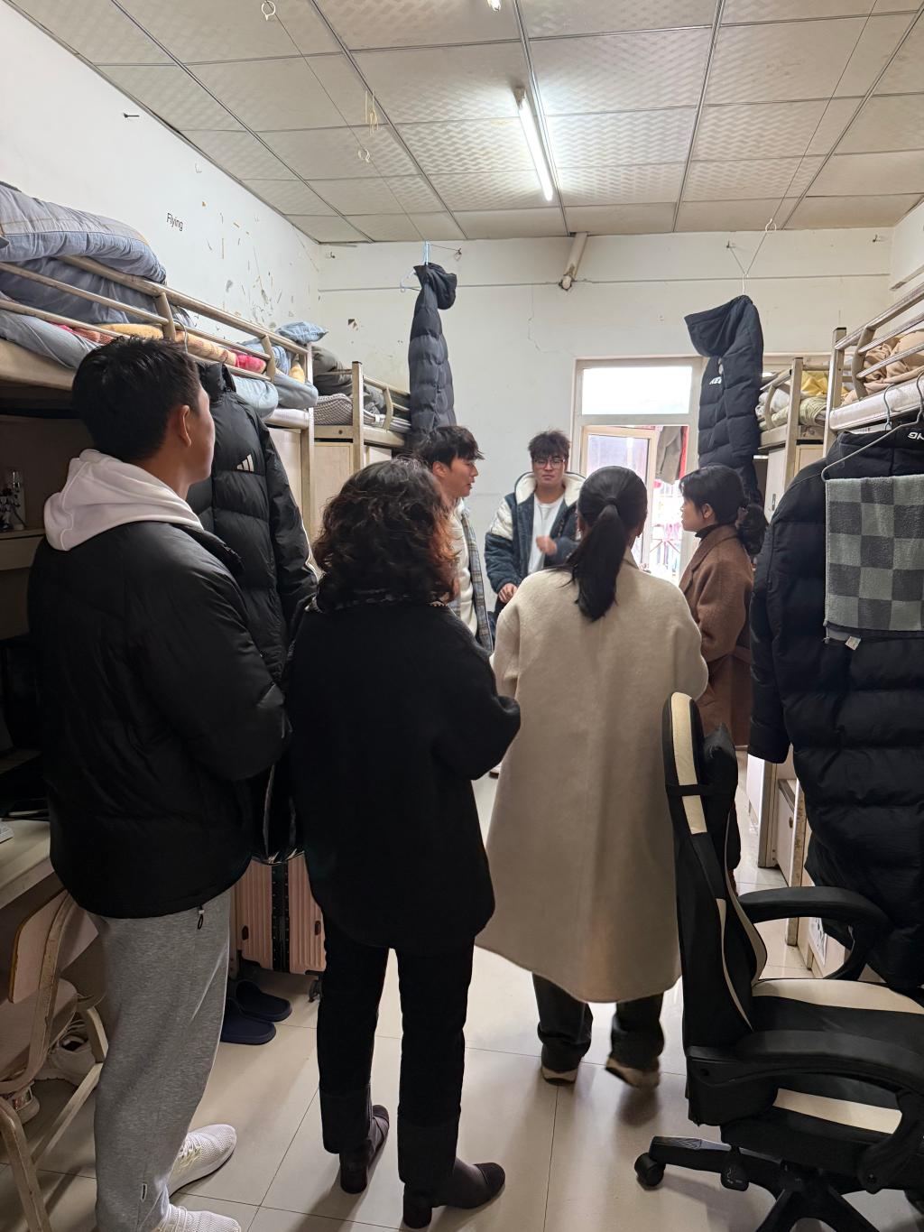 此外,重点检查了宿舍用电安全、消防安全、财物安全及卫生状况。仔细查看有无违规电器、私拉乱接电线、易燃杂物堆积等现象,反复叮嘱同学们务必增强安全意识,严格遵守宿舍管理规定,特别注意冬季用电取暖安全,做到人走断电,确保宿舍这个“小家”的绝对安全。最后,还细致了解同学们在饮食起居、御寒保暖、疾病防护等方面的具体情况,询问供暖是否充足、生活上有无不便。通过轻松愉快的谈心谈话,老师们关注同学们近期的思想状况、心理状态和人际交往情况,给予了针对性的鼓励、疏导与支持,引导大家树立积极乐观的人生态度,合理规划未来发展。