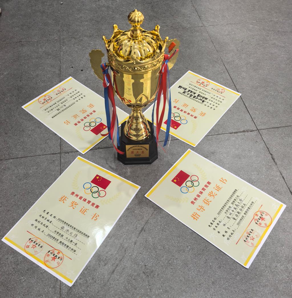 在8月16日至17日于贵阳市第六中学(白云校区)举行的2025年贵州省学生智力运动会围棋赛上,我校代表队由2021级针灸推拿(1)班的张添文博、2023级中医养生班的赵浩君、2022级袁家玑班的李沁镅组成,经过2天共6轮的角逐,荣获团体第三名的优异成绩!张添文博同时荣获大学生组个人第一名,李沁镅荣获女子个人第六名。